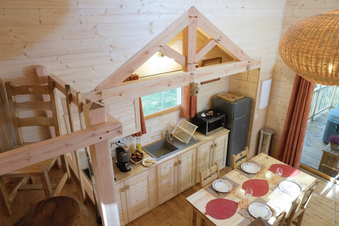 La Cabane du Grand Chêne vous invite à vivre une expérience unique, perchée à 7 mètres de hauteur autour d’un majestueux chêne centenaire. Cette cabane élégante offre un refuge